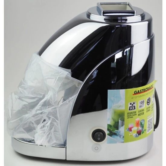 Gastroback Elektrischer Eis-Crusher. Typ des ice crusher: Elektro, Produktfarbe: Silber, Fassungsvermögen: 1,5 l. Leistung: 100 W, AC Eingangsspannung: 220 – 230 V, AC Eingangsfrequenz: 50 – 60 Hz. Breite: 150 mm, Tiefe: 240 mm, Höhe: 240 mm