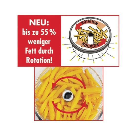 Neu: Mit Rotation, bis zu 55% weniger Fett im Vergleich zu herkömmlichen Fritteusen Rotation mit 2 Geschwindigkeitsstufen auch für besonders empfindliches Frittiergut geeignet Geschwindigkeitseinstellung und Timer mit kontrollleuchte Variabel einstellbarer 2.000 Watt Hochleistungsthermostat für eine schonende Zubereitung Korb-lift Funktion zum einfachen Entnehmen Deckel mit Sichtfenster, einfaches Aufklappen auf Knopfdruck Abnehmbarer 2,5 Liter Öl Tank mit Antihaftbeschichtung Tauchheizkörper Frittiertimer mit Kontrollleuchte Sicherheitsabschaltung B x T x H: 255 x 350 x 255 mm Gewicht: 4,65 kg